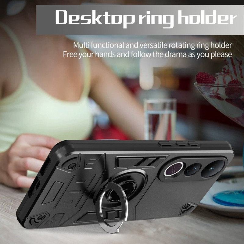 Protégez votre Vivo V50 Lite 5G avec cette coque à double couche offrant un support anneau rotatif à 360°, une protection anti-chute renforcée et une compatibilité avec les supports magnétiques de voiture. Design ergonomique avec rebords surélevés pour protéger l'écran et la caméra.