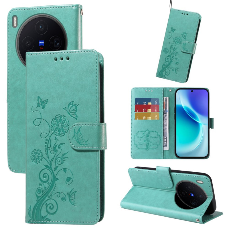 Étui portefeuille élégant pour Vivo X300 5G avec imprimé papillon et floral. Comprend un support mains libres, des emplacements pour cartes et une protection intégrale. Design raffiné alliant style et fonctionnalité pour votre smartphone.