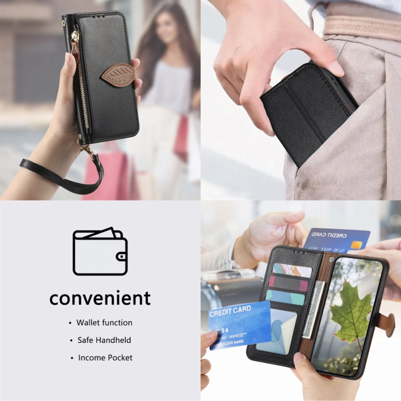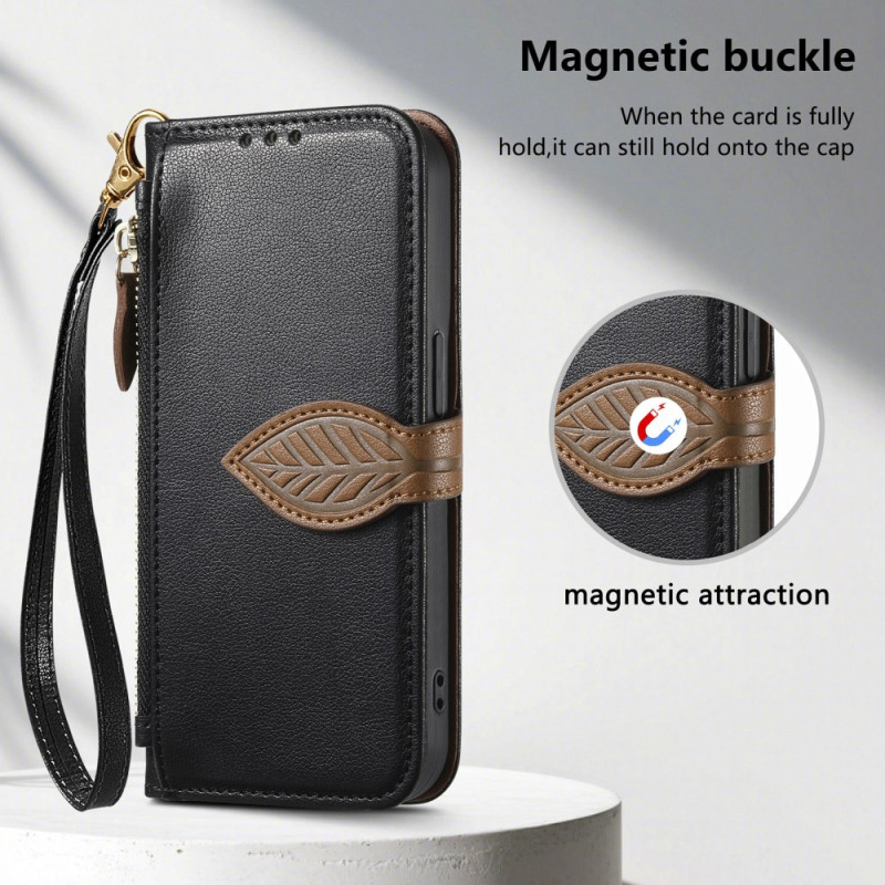 Étui portefeuille élégant pour Xiaomi 17 Pro Max avec fermeture magnétique en forme de feuille. Dispose de 3 emplacements pour cartes, 1 poche à billets, une poche zippée extérieure et une dragonne amovible. Support intégré pour visionnage mains libres.
