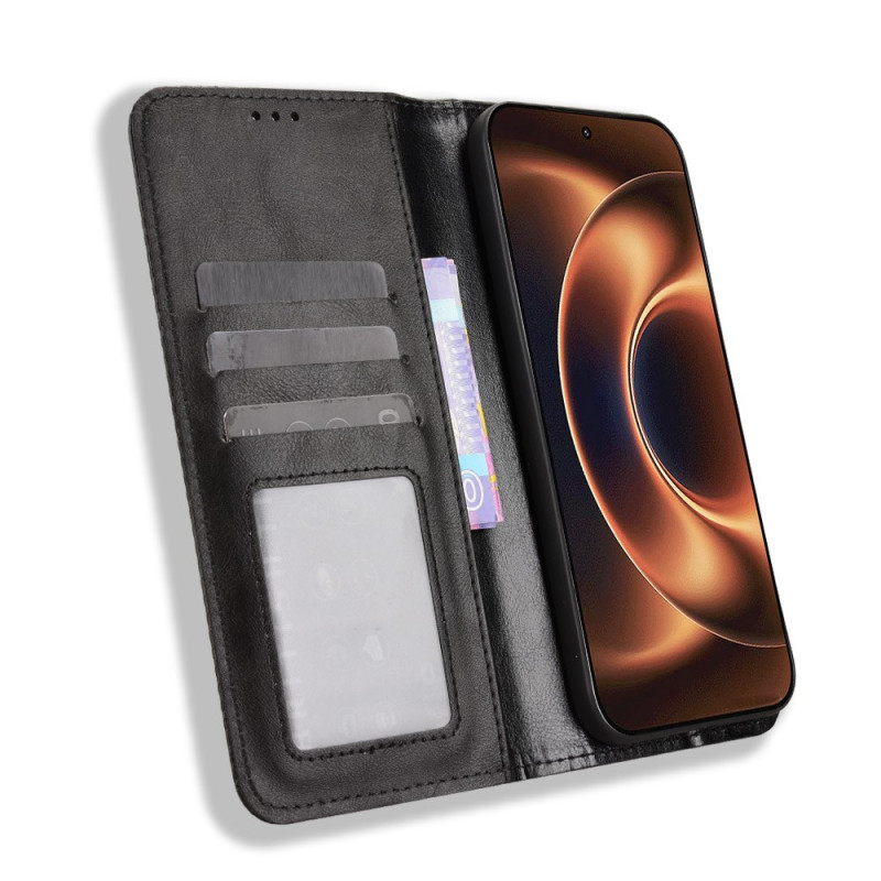 Protégez votre Xiaomi 17 Ultra avec élégance grâce à cet étui portefeuille rétro. Doté de multiples fentes pour cartes, d'un support ajustable et d'une fermeture magnétique automatique, il allie style vintage et fonctionnalité moderne.