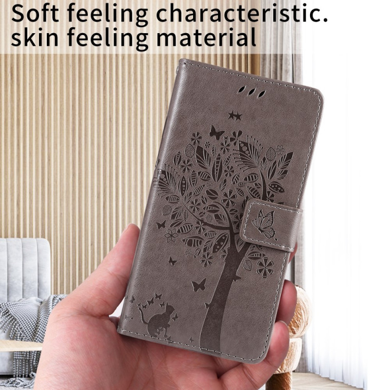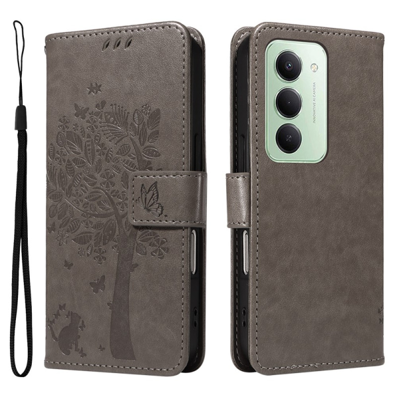 Étui portefeuille en cuir de qualité supérieure avec motif chat et arbre pour Xiaomi Redmi 15 4G (EU). Offre une protection élégante et robuste avec des fonctionnalités pratiques comme un support intégré, des emplacements pour cartes et une dragonne.