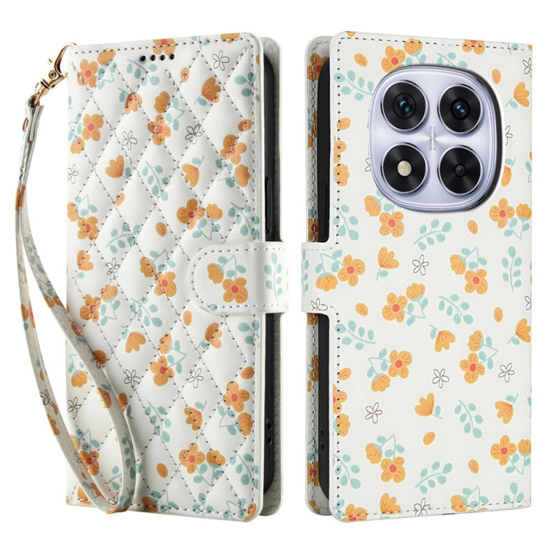 Étui portefeuille élégant pour Xiaomi Redmi Note 15 Pro 4G offrant une protection intégrale. Design raffiné avec motifs floraux et surpiqûres losanges. Multiples emplacements pour cartes, support ajustable et dragonne pratique incluse.