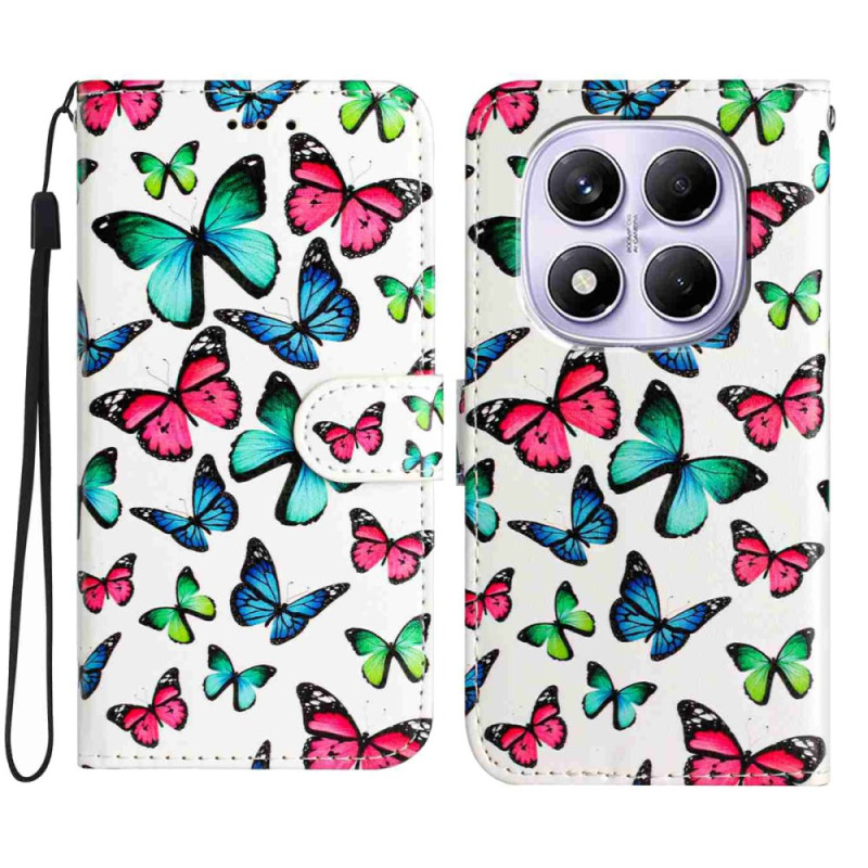 Étui portefeuille élégant avec motif papillons imprimé pour Xiaomi Redmi Note 15 Pro 4G. Protection complète avec support réglable, fermeture magnétique sécurisée, 3 emplacements pour cartes et dragonne détachable incluse.