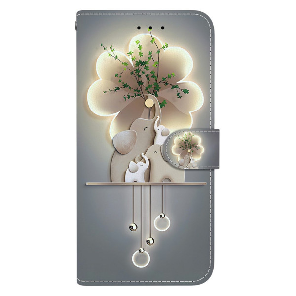 Étui portefeuille élégant avec motif trois éléphants pour Xiaomi Redmi Note 15 Pro 5G. Design à rabat magnétique avec fonction support, porte-cartes intégrés et dragonne amovible. Protection complète et style au quotidien pour votre smartphone.