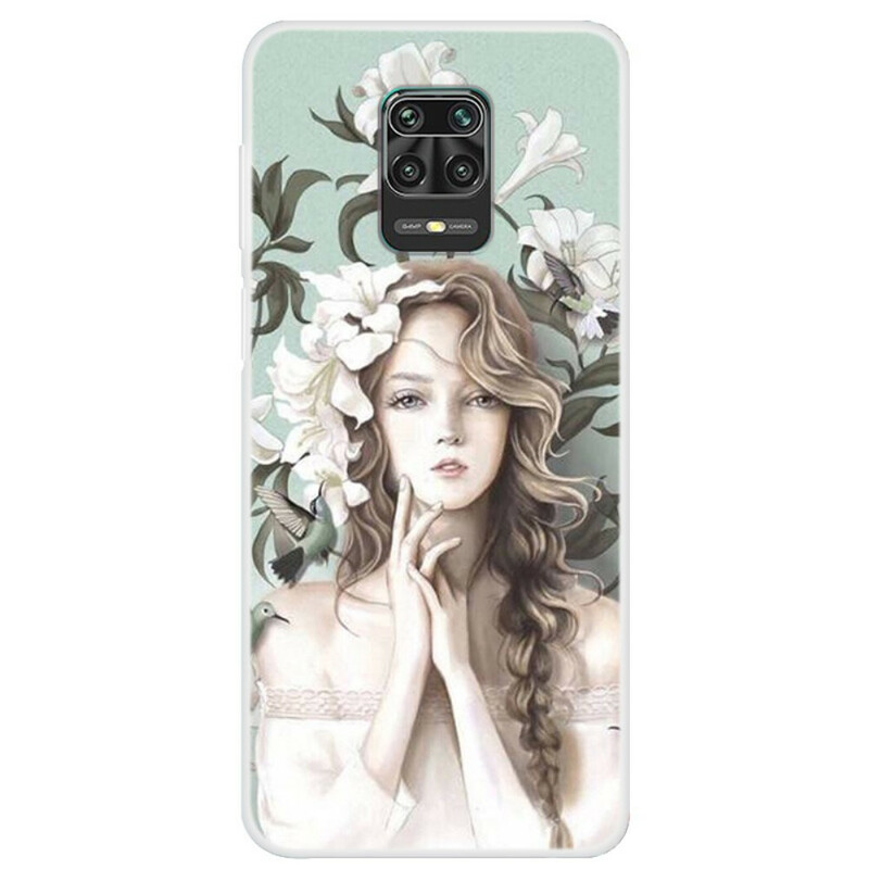 Une coque en silicone, avec un design épuré représentant une femme entourée de fleurs, pafaite pour votre Xiaomi Redmi Note 9S / Redmi Note 9 Pro.